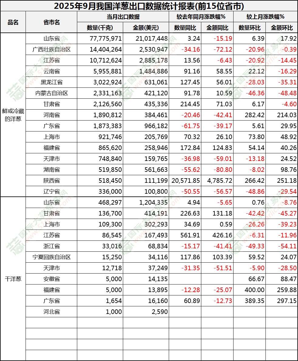 2025年9月洋蔥出口數(shù)據(jù)(按省市)
