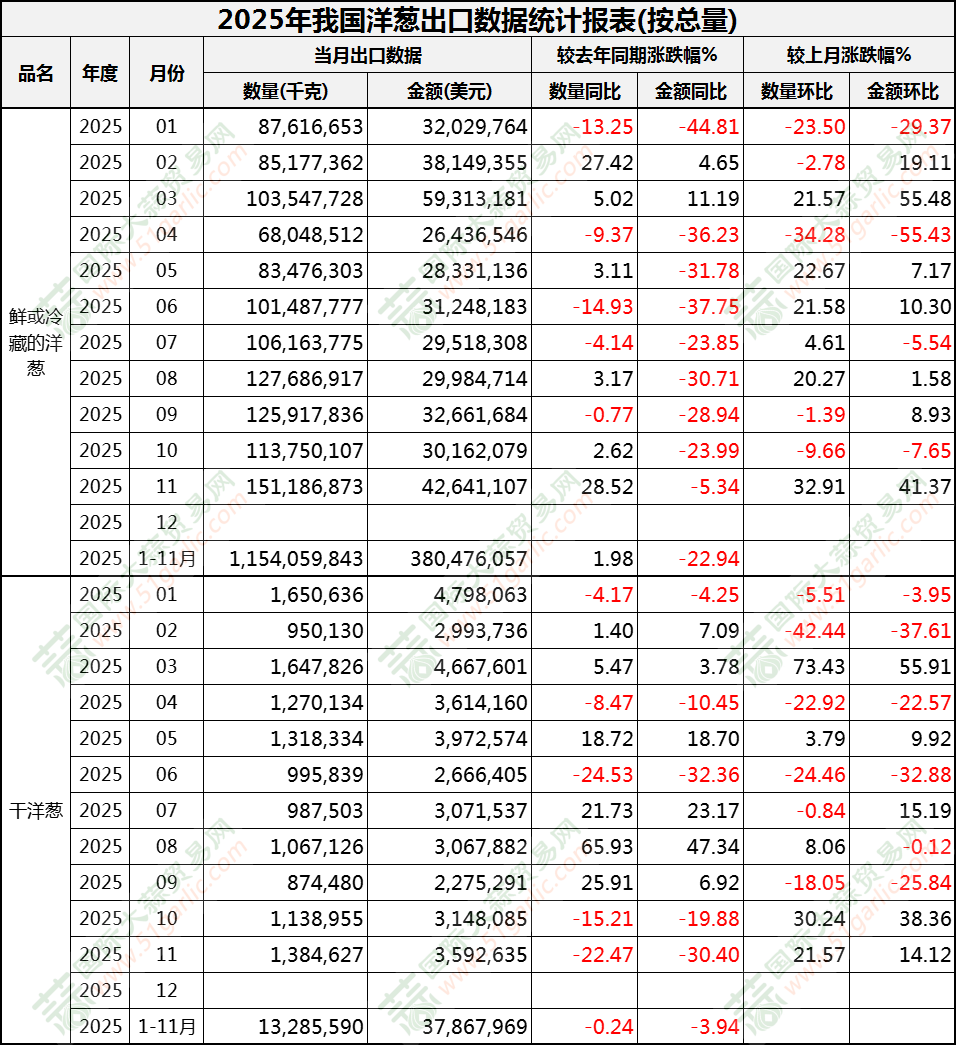 2025年11月洋蔥出口數(shù)據(jù)(按總量)